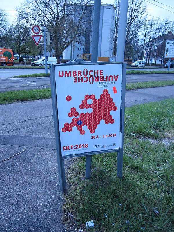 Veran­stal­tungs­pla­ka­tie­rung ist nach städti­scher Polizei­ver­ord­nung geneh­mi­gungs­pflich­tig. Zulässig ist nur Plakat­stän­d­er­wer­bung für nicht-kommer­zi­el­le Veran­stal­tun­gen in Karlsruhe.