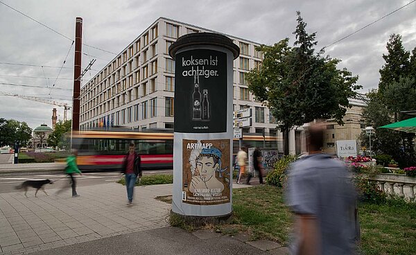 Hier wird im Spezi­al­for­mat um eine gesamte Säule plakatiert. Ca. 45 Säulen sind im Stadt­ge­biet aufgestellt.