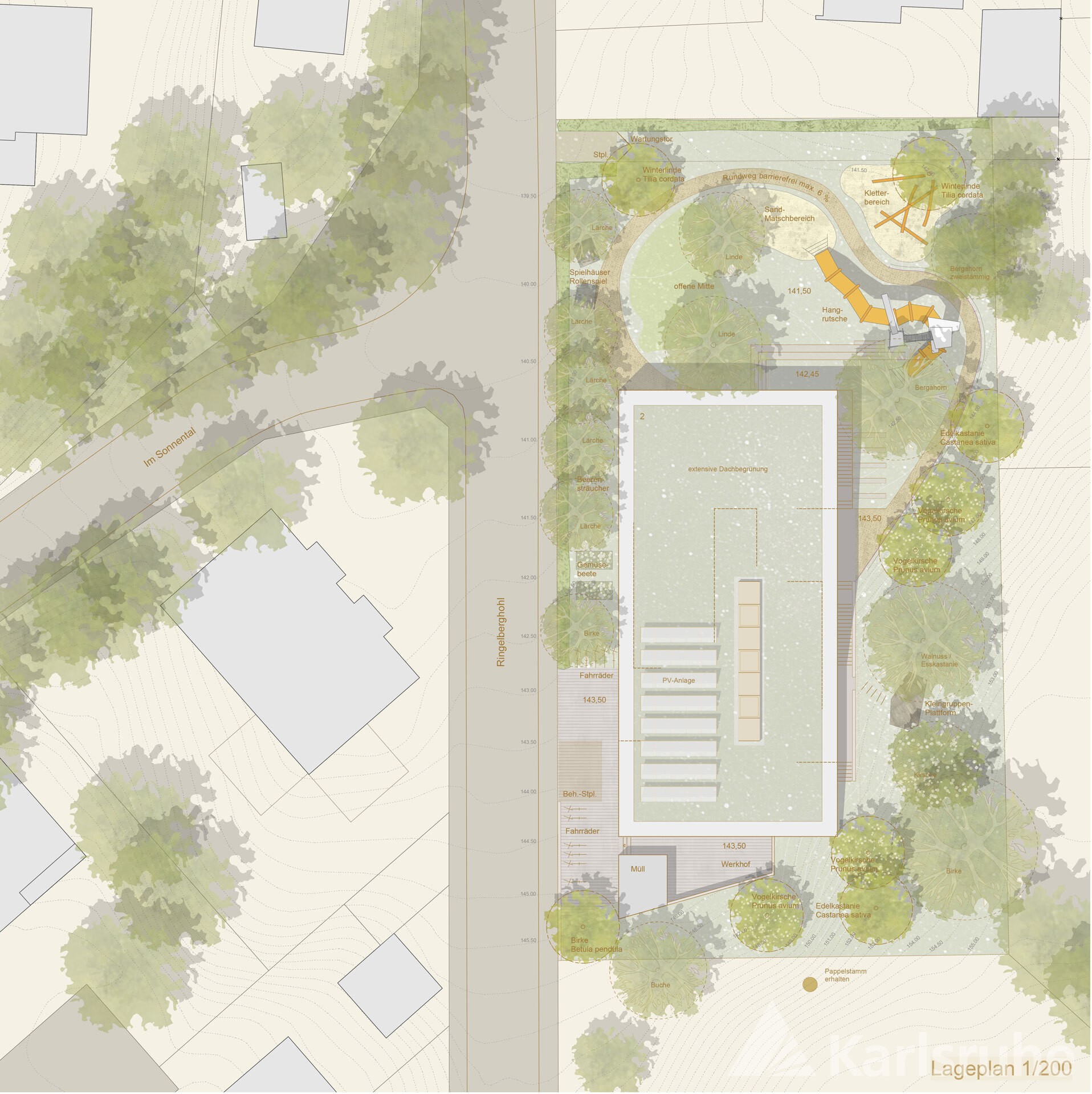 | Preisgericht | Vorsitz: Prof. Meinrad Morger, KIT Karlsruhe, Fakultät für Architektur Daniel Fluhrer, Bürgermeister Stadt Karlsruhe Elke König, Sozial- und Jugendbehörde, Stadt Karlsruhe Prof. Günter Pfeifer, TU Darmstadt, Fachbereich Architektur Prof. Anne Sick, Leiterin Amt für Hochbau und Gebäudewirtschaft, Stadt Karlsruhe |