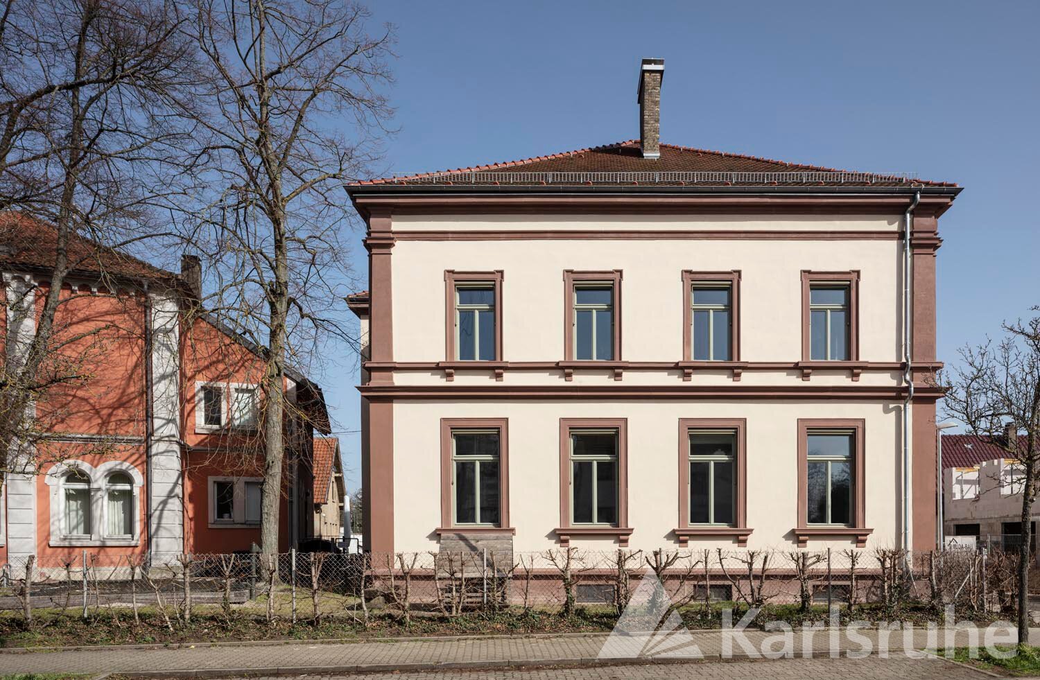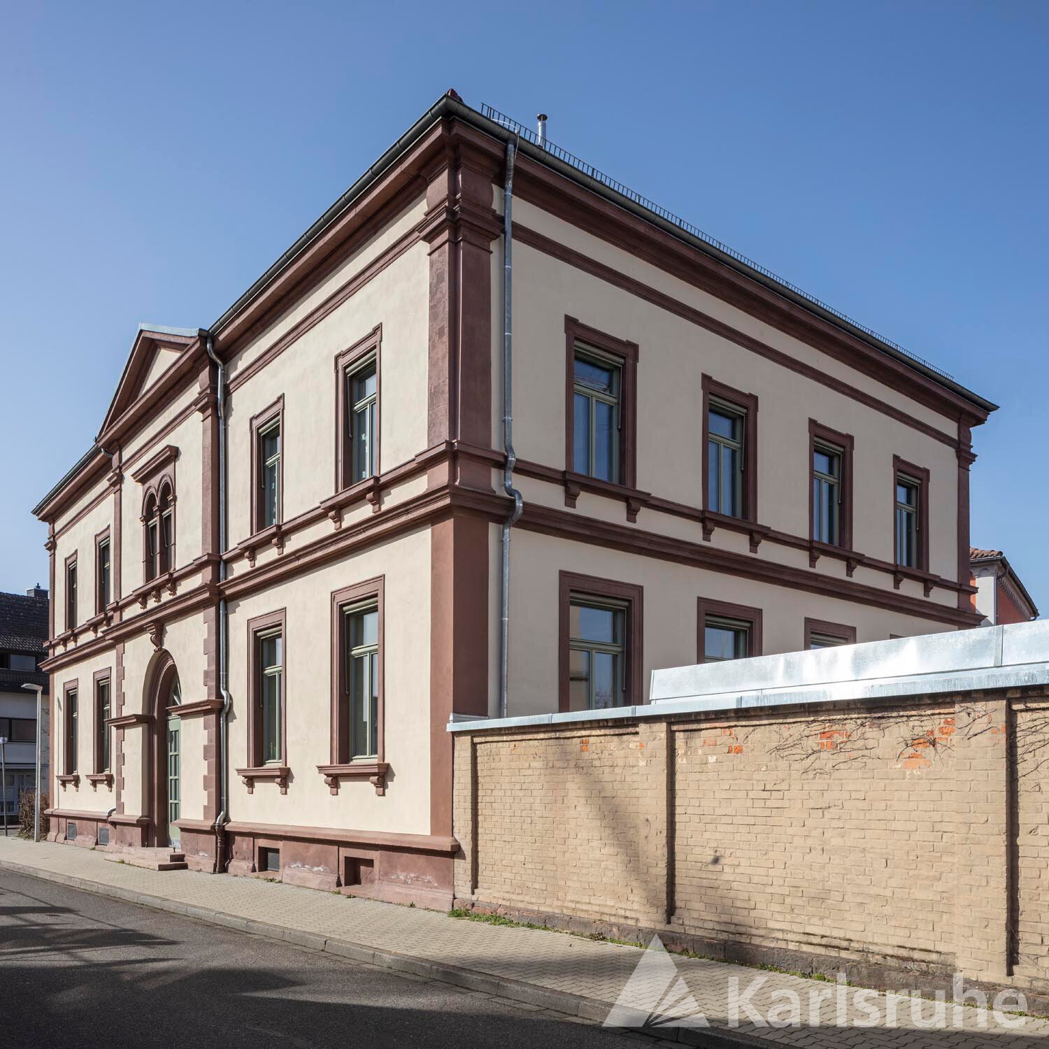 Im Fokus der Sanierungsarbeiten standen die Sandsteinelemente des Gebäudes, da Verwitterung, mangelhafte Verfugung und ein abblätternder Anstrich, Optik und Sicherheit der in Sandstein gefertigten Fassadenelemente beeinträchtigten. Doch auch andere Elemente waren in Mitleidenschaft gezogen. Dazu gehörte der Putz: Der Ober- hatte sich vom Unterputz gelöst und Blasenbildung begünstigt. Zur Aufgabe gehörte ebenfalls, die nicht bauzeitlichen Fenster zu erneuern und zwei vermauerte Fensteröffnungen wieder zu aktivieren. Die vorhandenen Innenfensterbänke waren asbesthaltig, die Elektrik lag teilweise auf Putz.