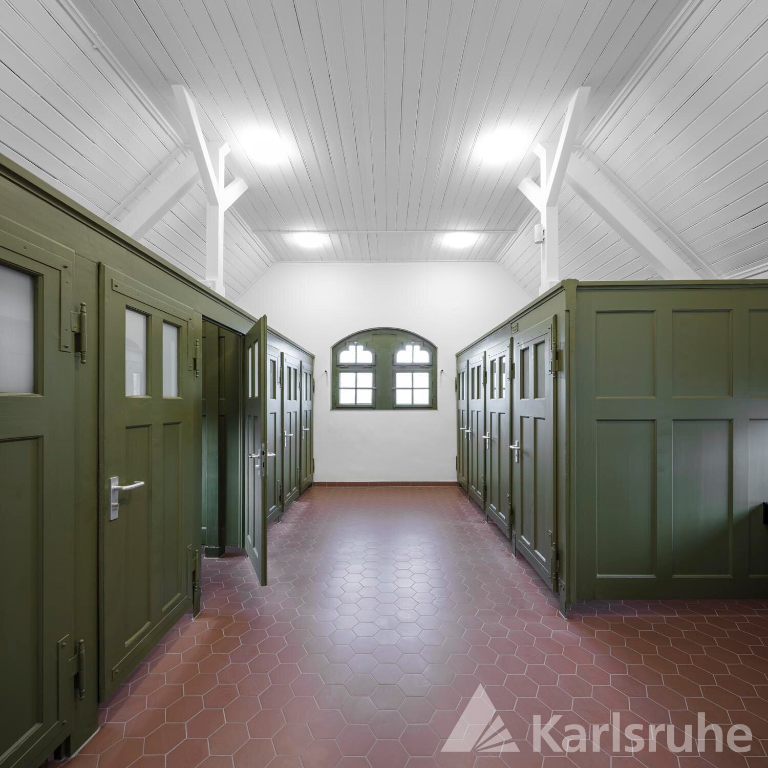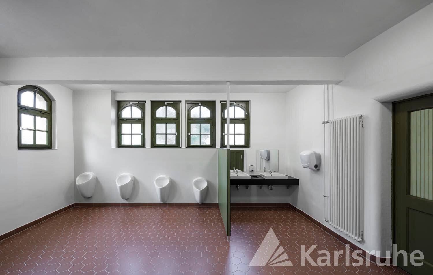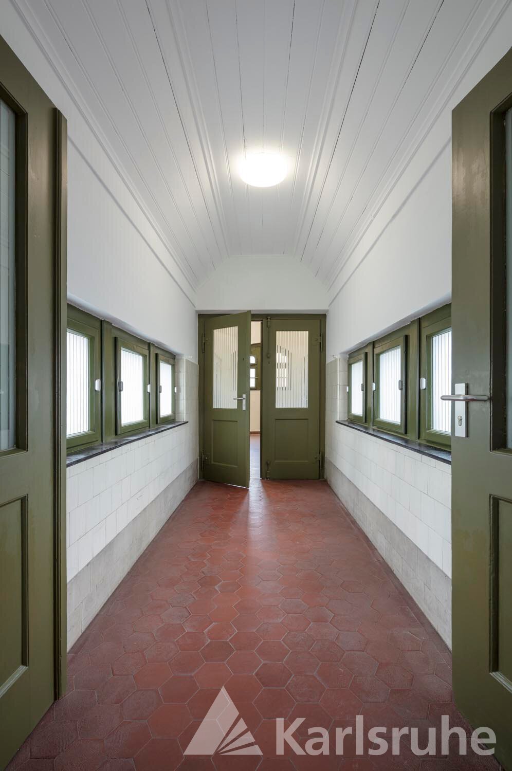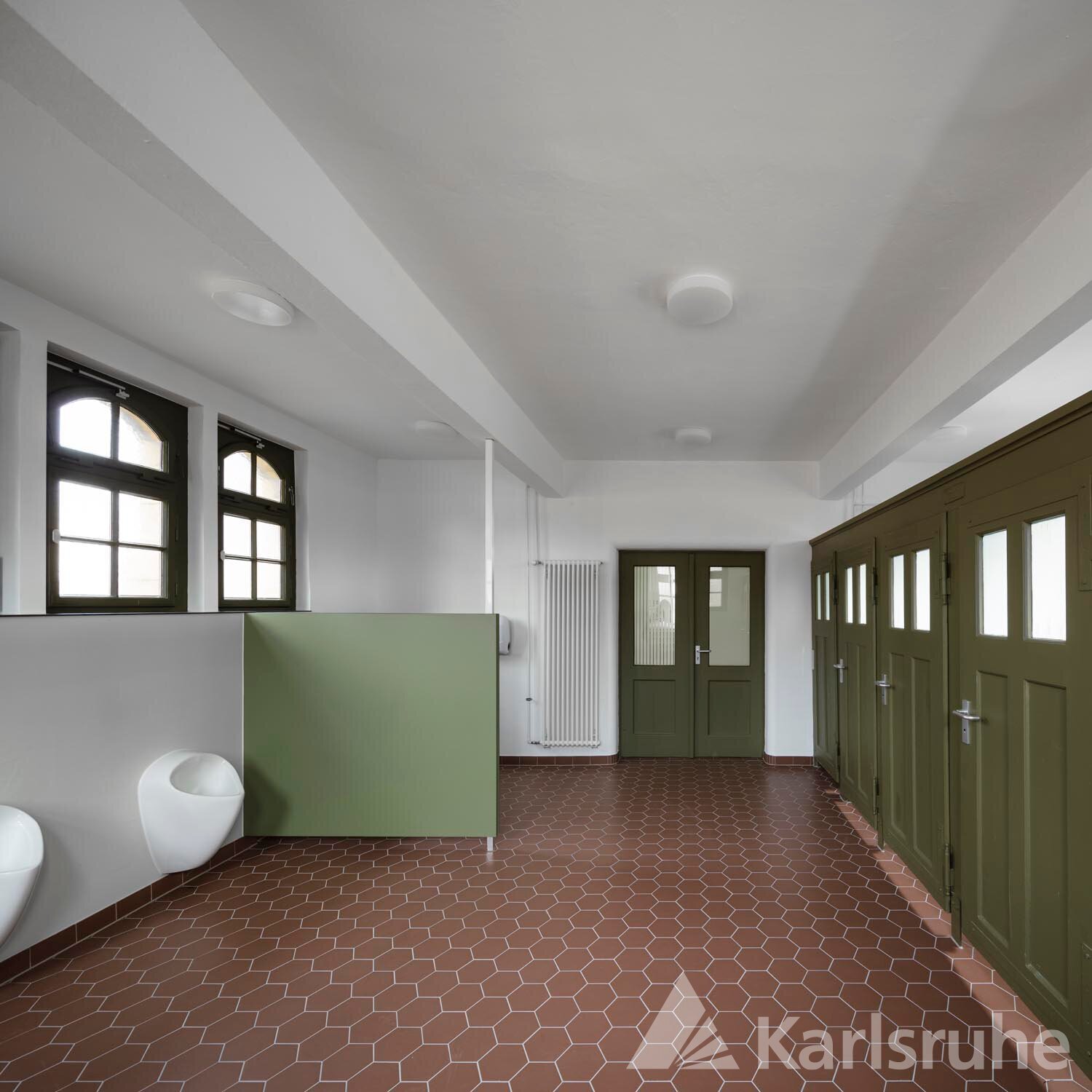 und saniert werden muss, ist er auch eine Herausforderung. Dieser kam das Karlsruher Architekturbüro BAU4 Architekten nach. Selbstverständlich wurden Sanitär-, Heizungs- und Elektrotechnik komplett erneuert. Dies wurde in den Sommerferien 2020 begonnen und Ende desselben Jahres auch abgeschlossen. Darüber hinaus wurden die bauzeitlichen Fenster und WC-Trennwände erhalten und aufgearbeitet. Optisches Highlight: Die in den Fluren und auf einer Kleinfläche in einem Putzraum erhaltenen sechseckigen Bodenfliesen. Diese wurden auf den übrigen Flächen ergänzt mit sechseckigen und an die historischen Vorbilder angepassten neuen Fliesen. Ziel war es, den bauzeitlichen Stil wiederzugeben, was auch gelungen ist.