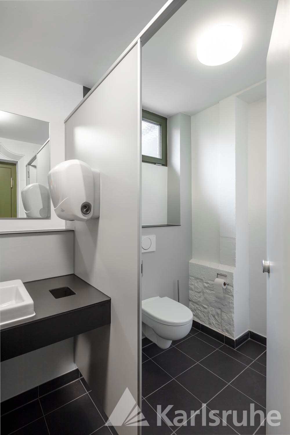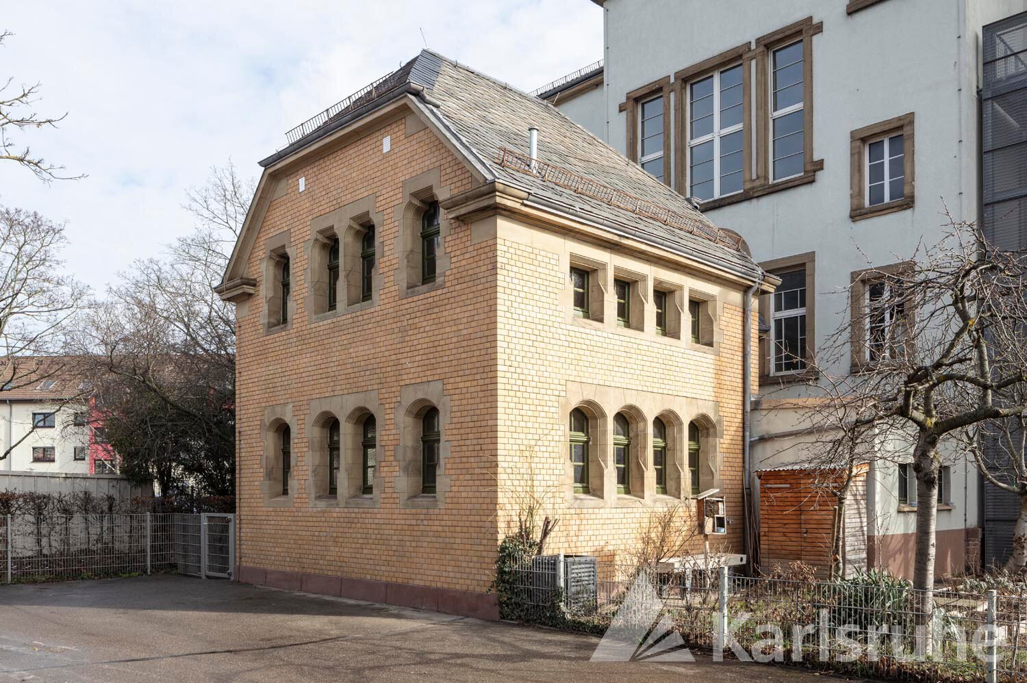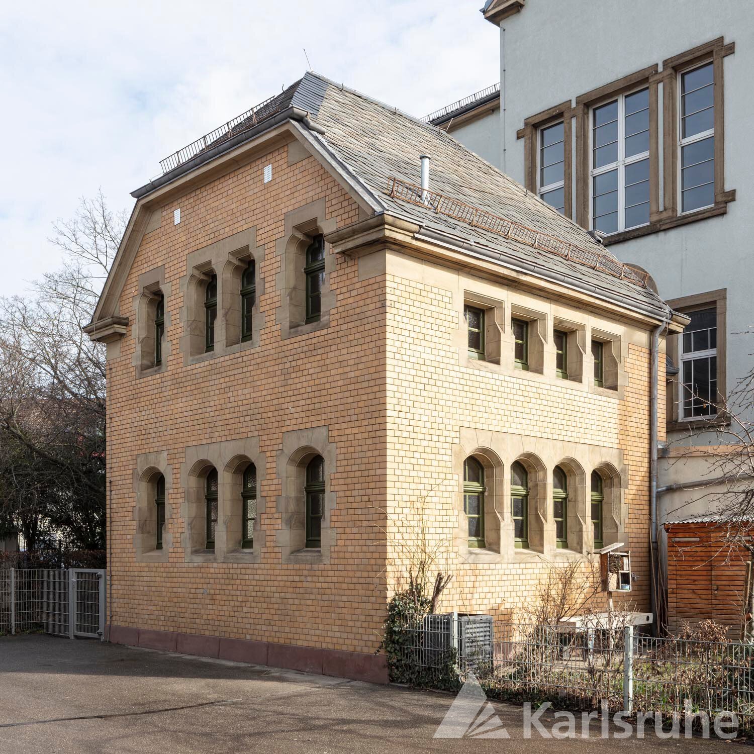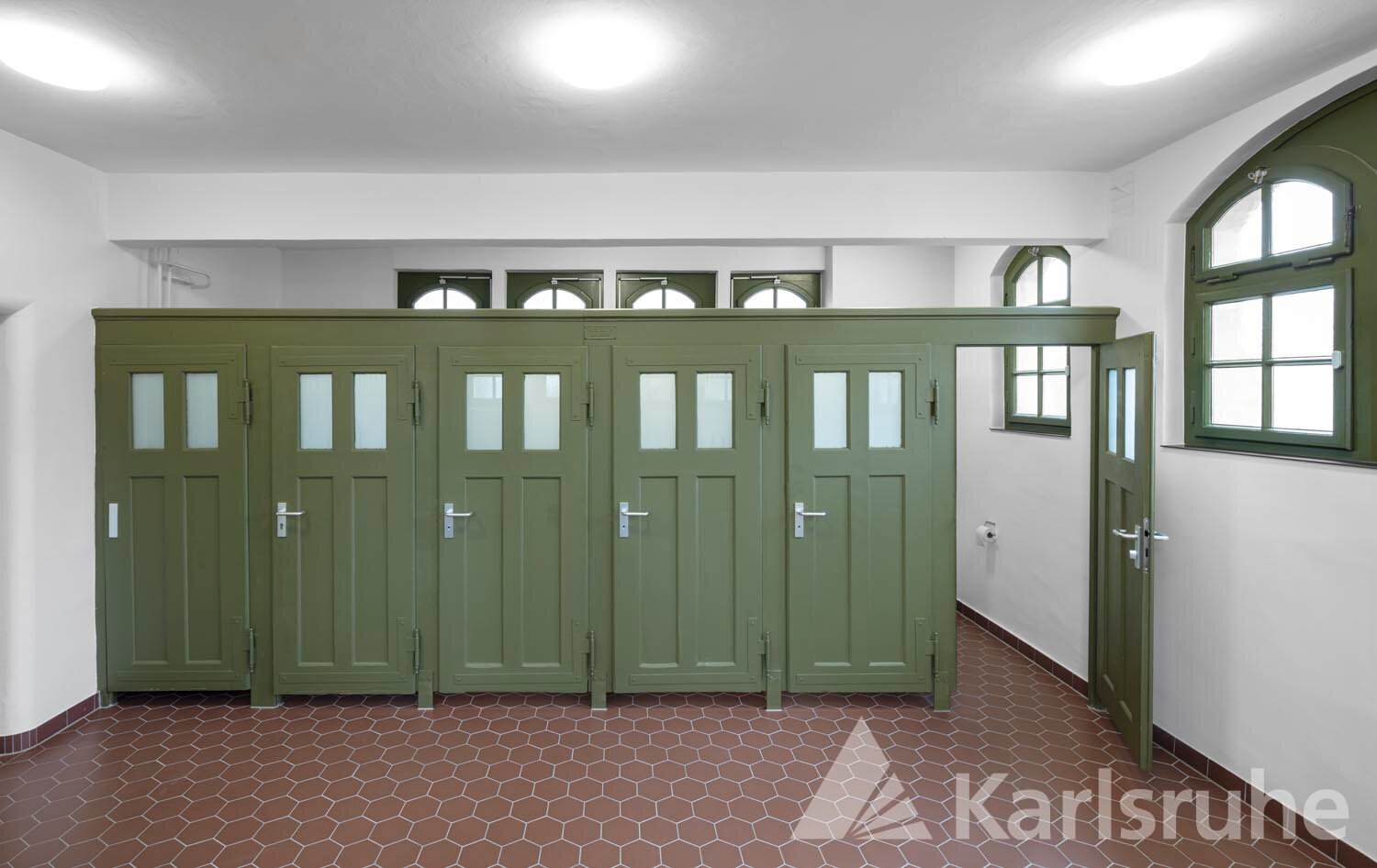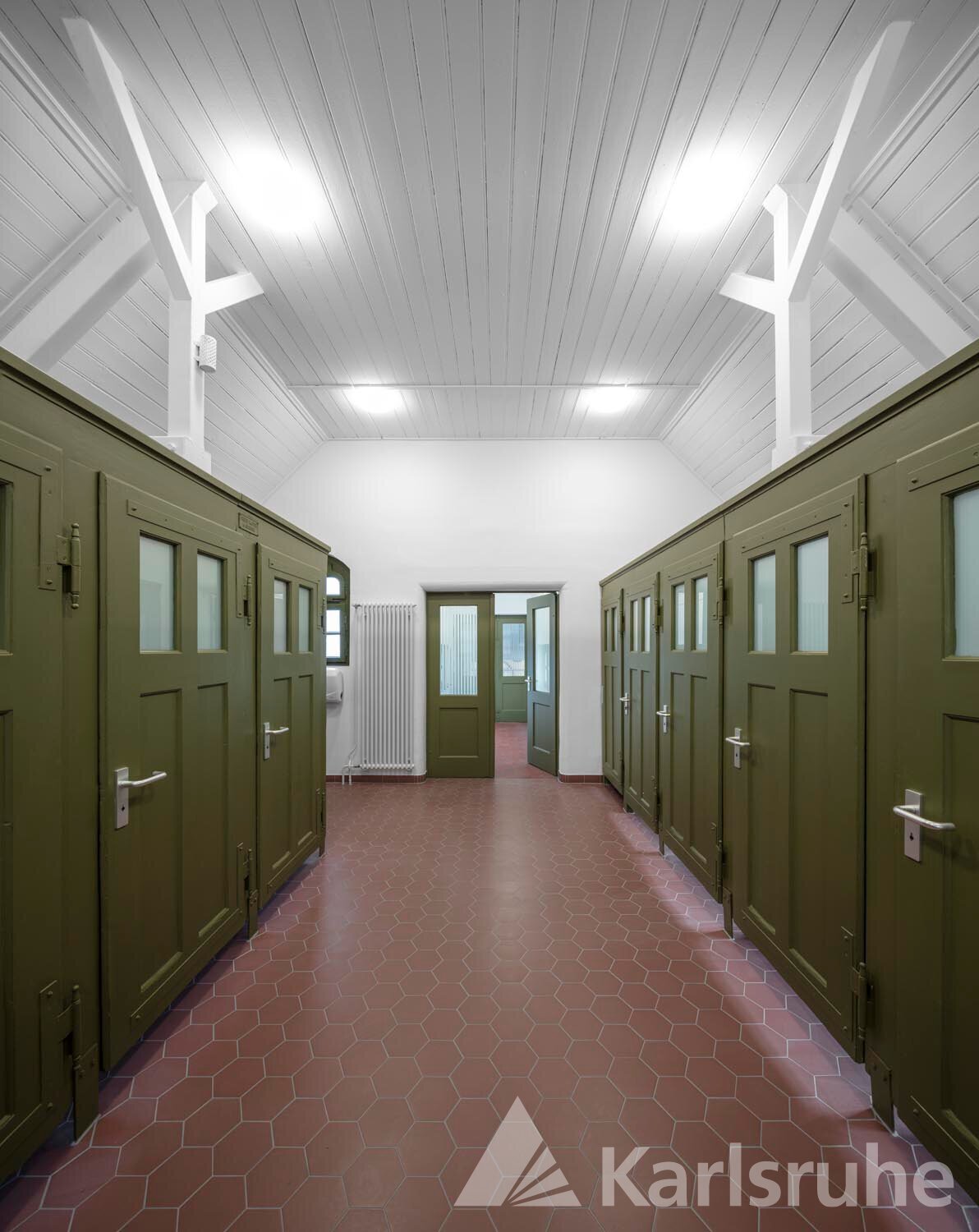 und saniert werden muss, ist er auch eine Herausforderung. Dieser kam das Karlsruher Architekturbüro BAU4 Architekten nach. Selbstverständlich wurden Sanitär-, Heizungs- und Elektrotechnik komplett erneuert. Dies wurde in den Sommerferien 2020 begonnen und Ende desselben Jahres auch abgeschlossen. Darüber hinaus wurden die bauzeitlichen Fenster und WC-Trennwände erhalten und aufgearbeitet. Optisches Highlight: Die in den Fluren und auf einer Kleinfläche in einem Putzraum erhaltenen sechseckigen Bodenfliesen. Diese wurden auf den übrigen Flächen ergänzt mit sechseckigen und an die historischen Vorbilder angepassten neuen Fliesen. Ziel war es, den bauzeitlichen Stil wiederzugeben, was auch gelungen ist.