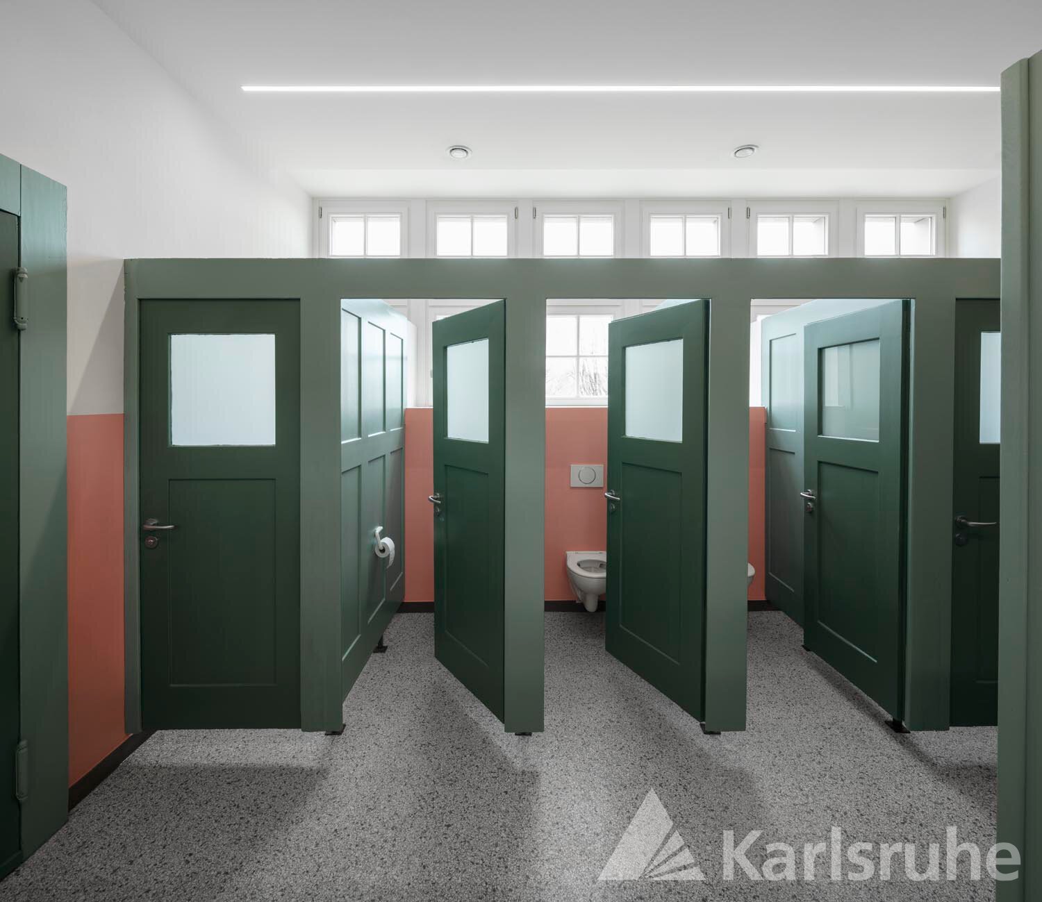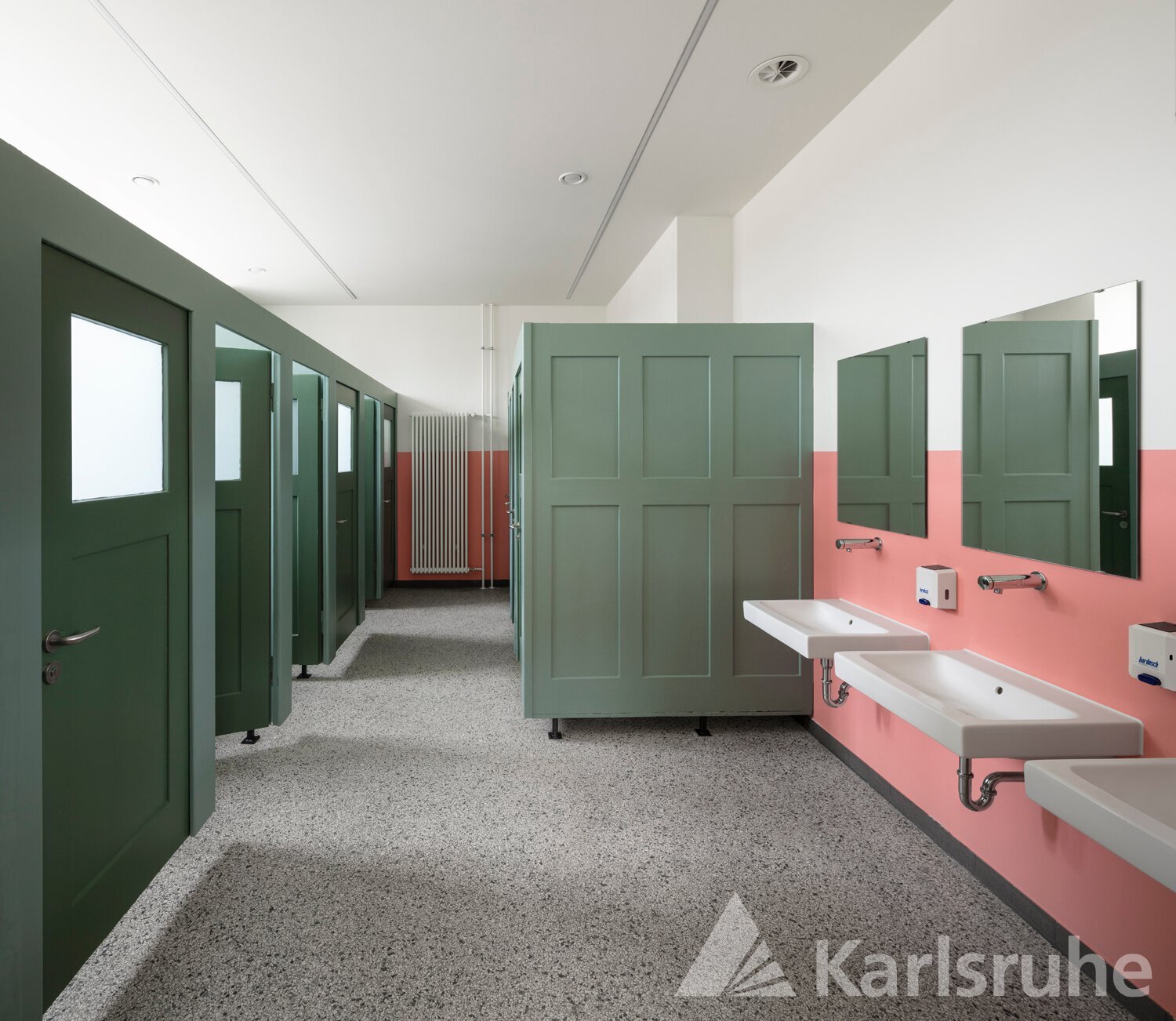 Die WC-Anlagen für Schüler und Lehrer wurden vollständig modernisiert. Ihre gesamte Technik wurde ausgetauscht und mit einer Lüftungsanlage mit Wärmerückgewinnung ergänzt, die Oberflächen von Wänden und Böden wurden erneuert. Auch hier wurde die historische Bausubstanz möglichst intakt erhalten und ergänzt: Die aus der Bauzeit erhaltenen Trennwände im Mädchen-WC im 1. Obergeschoss wurden aufgearbeitet und wiedereingesetzt, die Fenster denkmalgerecht ausgewechselt. Waren sie zuvor aus Kunststoff und nur an wenigen Stellen noch im Original – etwa in einem heutigen Lagerraum über den Toiletten im 2. Obergeschoss – vorhanden, wurden sie nun in Absprache mit dem Landesdenkmalamt und der Unteren Denkmalschutzbehörde gegen Holzfenster ausgetauscht, die sich an den historischen Bestand anlehnen.