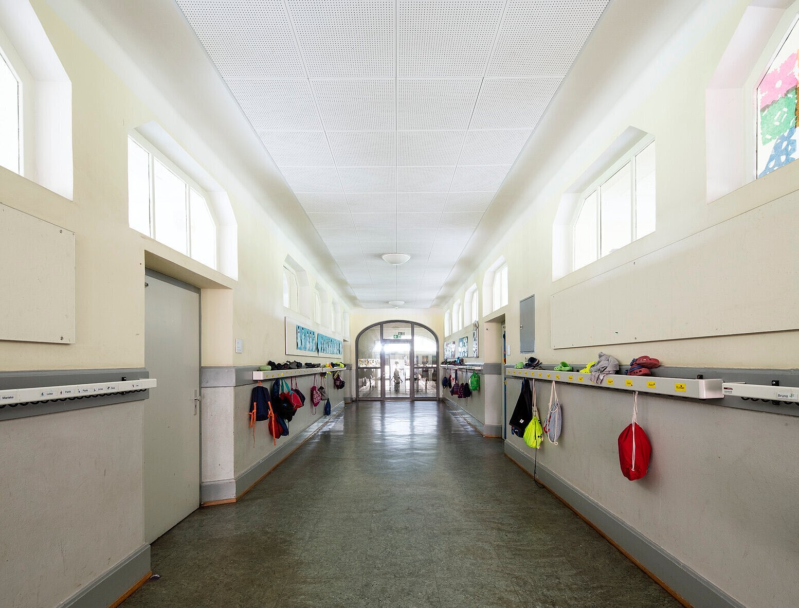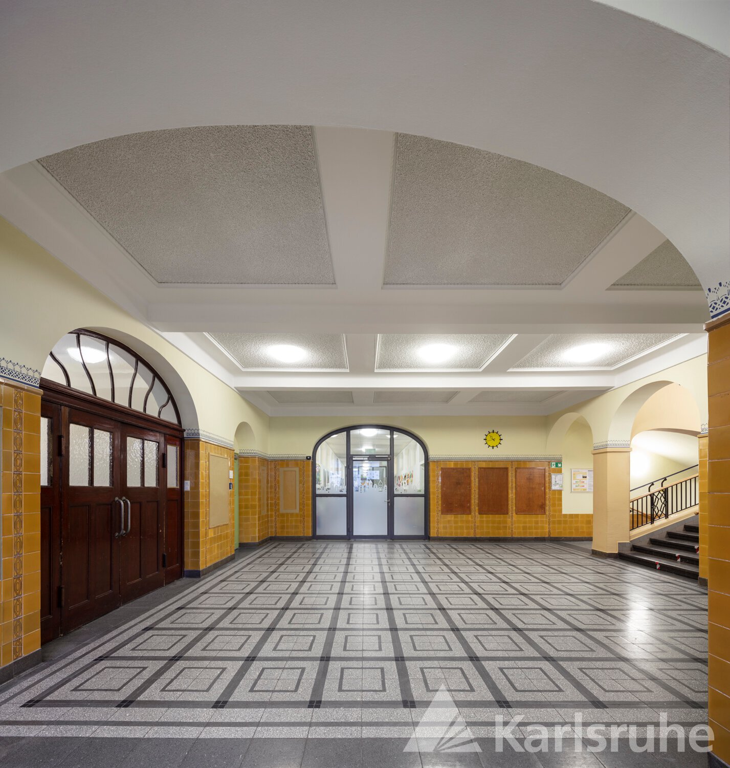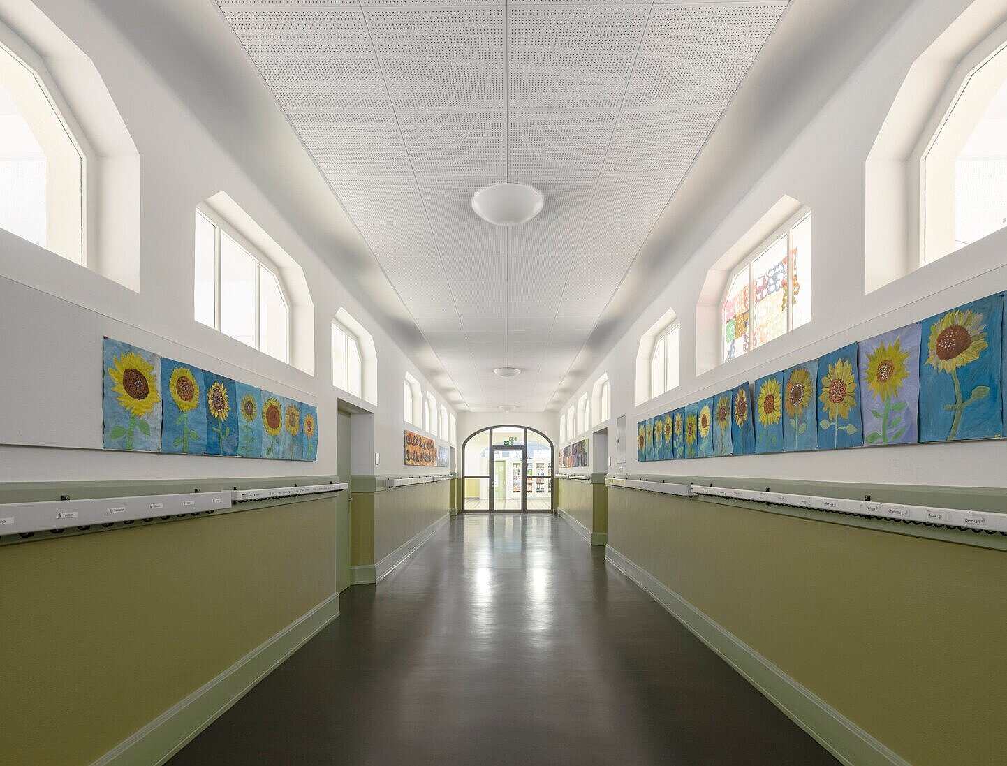 Darüber hinaus wurde die verbindende Erschließung der Schule renoviert: Flure, Treppenhäuser und Foyers erhielten einen neuen Anstrich, der die prägnante Farbgestaltung aus der Entstehungszeit des Baus aufgreift. Eigens durchgeführte restauratorische Untersuchungen erlaubten Rückschlüsse auf Beichels Farbkonzept und offenbarten manche Überraschung. So tragen etwa die Sockelzonen der Flure nun wieder warme Grüntöne statt nüchternen Graus. Ein jahrzehntelang verdecktes Ornamentfries zieht sich als Bordüre um die Wände des Foyers – erst durch die Sanierungsarbeiten kam es wieder ans Tageslicht.