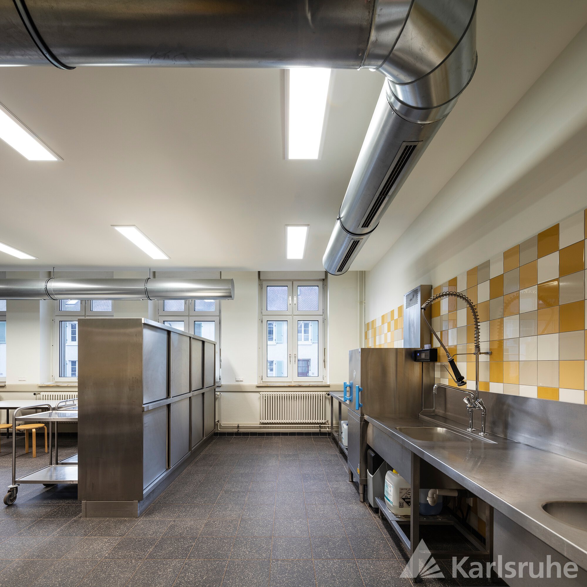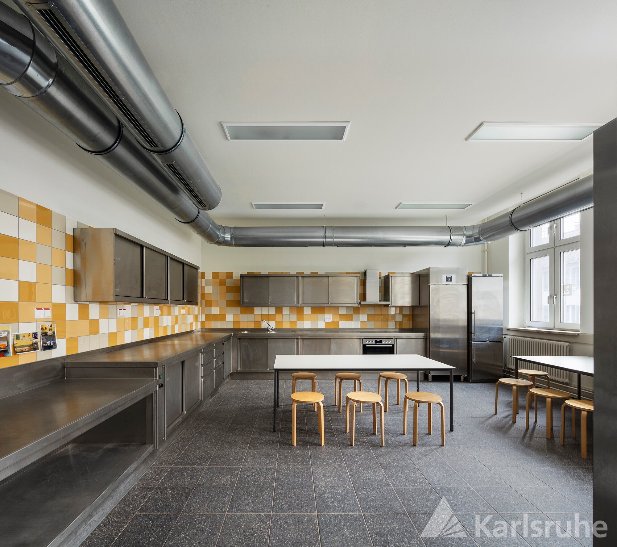 Über 100 Jahre Lernen gehen an einer Schule nicht spurlos vorbei: Die Riedschule in Alt-Rüppurr, die zwischen 1911 und 1913 von Friedrich Beichel als Volksschule für ein Neubaugebiet im südwestlichen Teil von Alt-Rüppurr errichtet wurde, ist heute eine Grundschule und Lernheimat von knapp 200 Schülern und Schülerinnen. Für sie bietet der Stadtjugendausschuss im Schülerhort ein Betreuungsangebot an, dessen Küche inzwischen veraltet und zu klein geworden war. Deshalb wurde ein alter Klassenraum in eine moderne Küche umgewandelt und die alte Küche in einen Mehrzweckraum umfunktioniert.