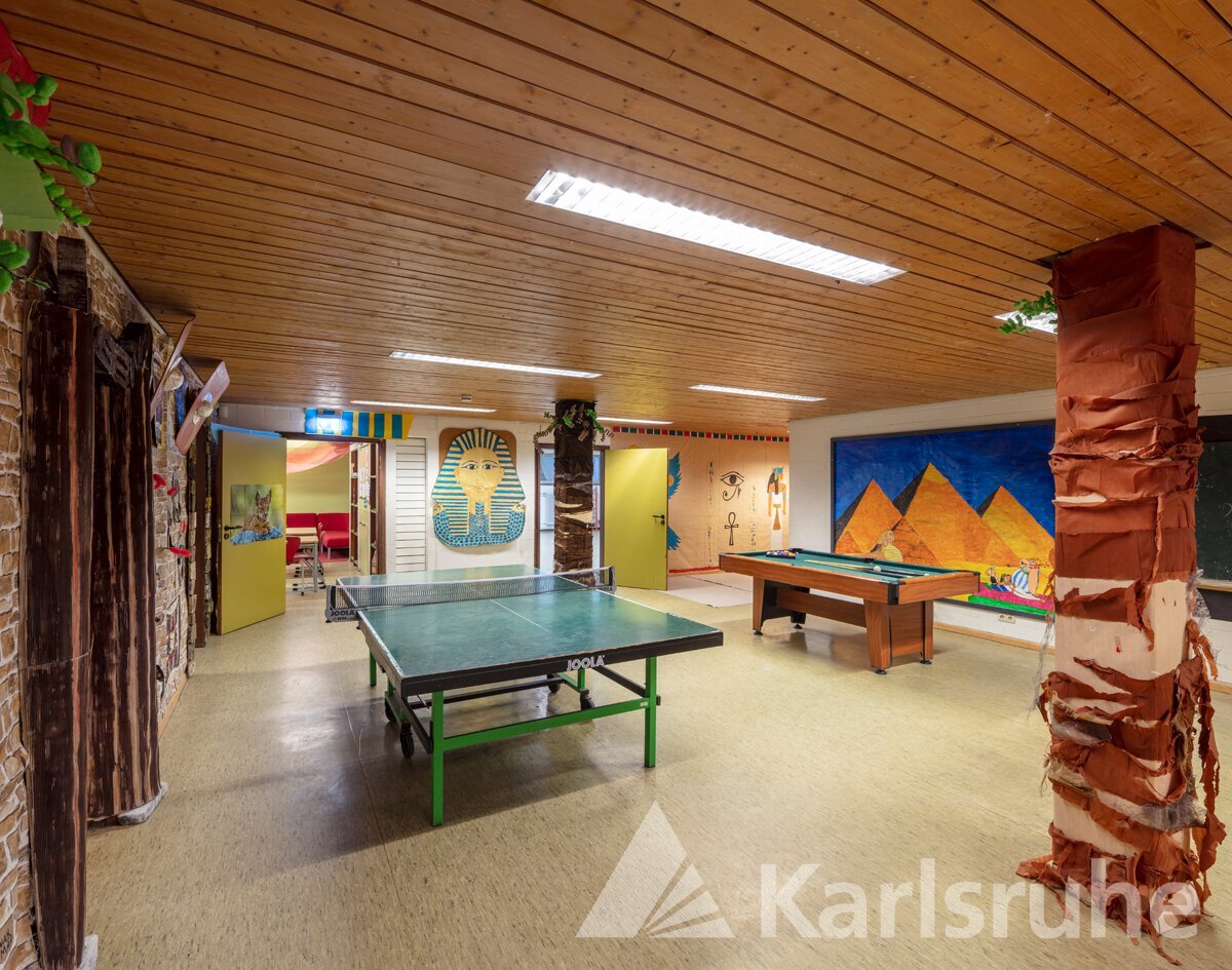 Zu sehen ist der Flurbereich im Keller mit einer alten Holzdecke und Linoleumboden, ausgestattet mit einer Tischtennisplatte und einem Billardtisch. Das Einrichtungsmotto dieser Zeit war Ägypten.