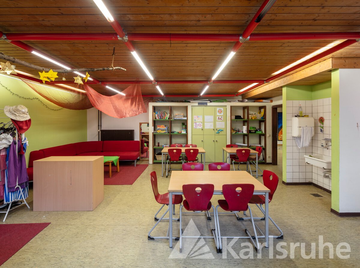 Zu sehen ist ein alter Gruppenraum vor der Sanierung mit Holzdecke und Linoleumboden. Der Raum ist mit verschiedenen Sitzmöglichkeiten eingerichtet und verfügt zusätzlich über eine Waschnische.