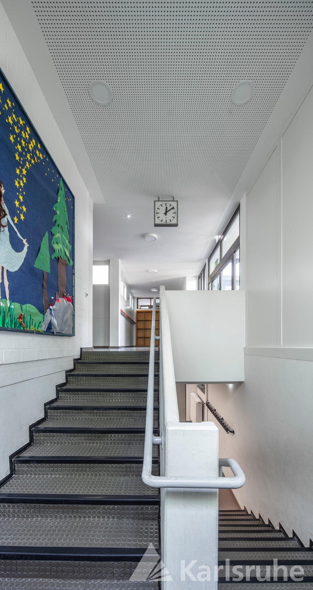Blick vom Treppenpodest die Treppe hinauf in den hellen Flur des Erdgeschosses mit neuer Akustikdecke und energieeffizienten LED-Leuchten.