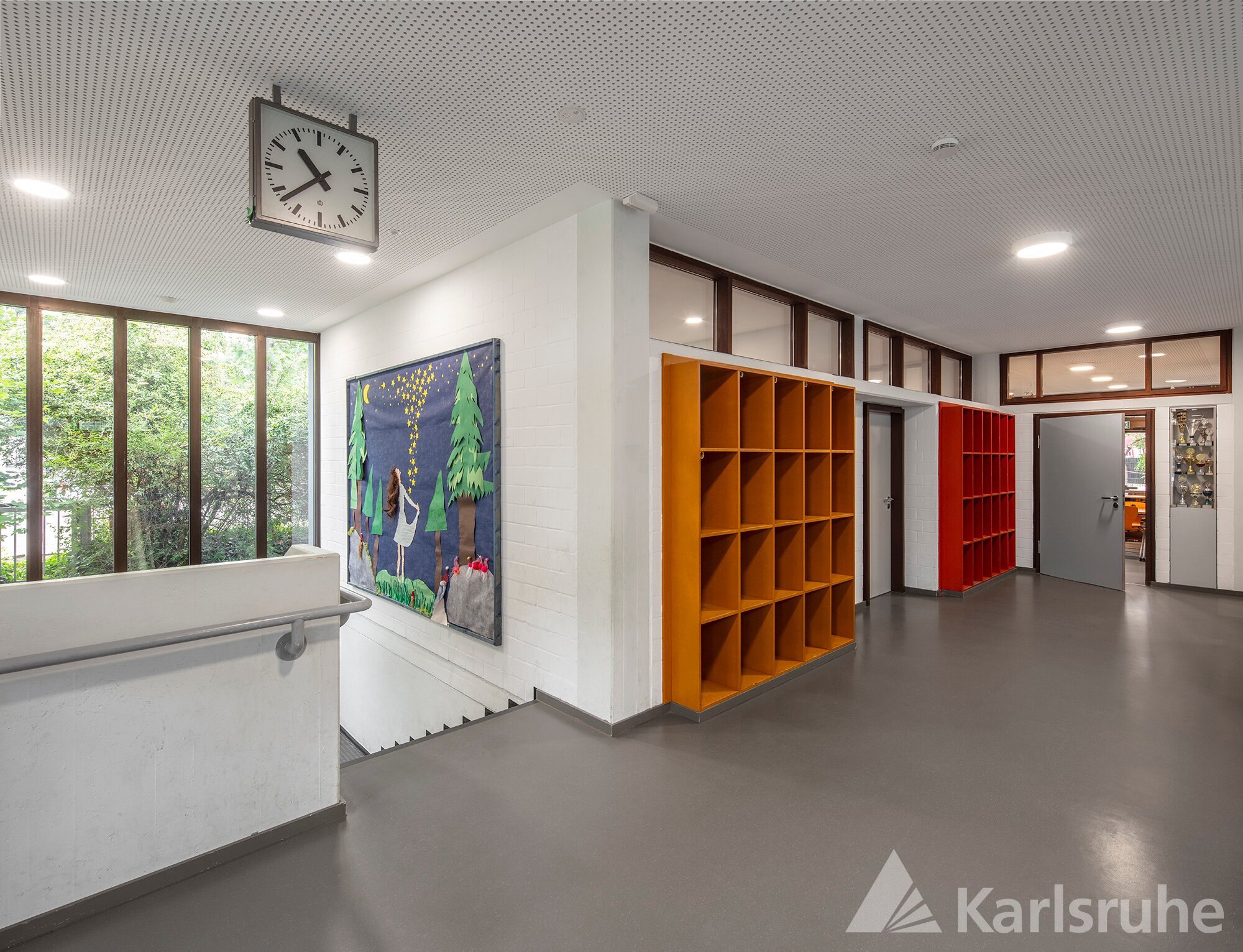 Das Bild zeigt den hellen Flurbereich mit erneuerten Türblättern der Gruppenräume, grauem Kautschukboden und weißer Akustikdecke. Die Einbauschränke und ein Bild am Treppenabgang setzen farbliche Akzente.