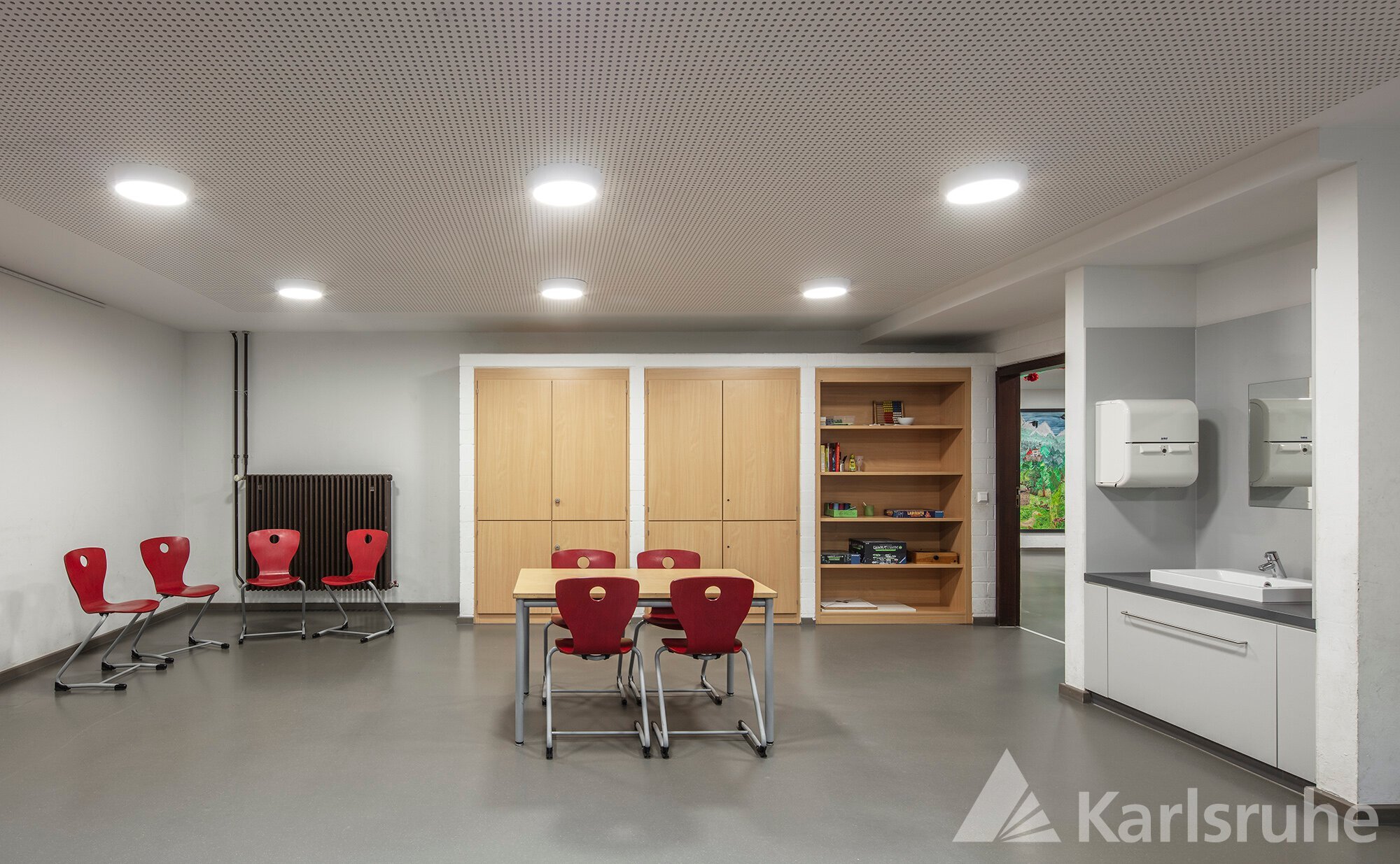Das Bild zeigt den hellen Gruppenraum mit neuem Kautschukboden, Gipskarton-Lochdecke mit energieeffizienten LED-Leuchten und sanierter Waschnische. Der Raum bietet viel Platz für eine individuelle Möblierung.