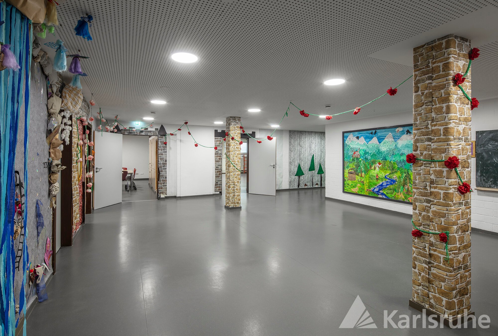 Das Bild zeigt den Flurbereich im Kellergeschoss mit neuem grauen Boden, heller Akustikdecke und energieeffizienten LED-Leuchten. Die Dekoration wirkt freundlich und naturnah.