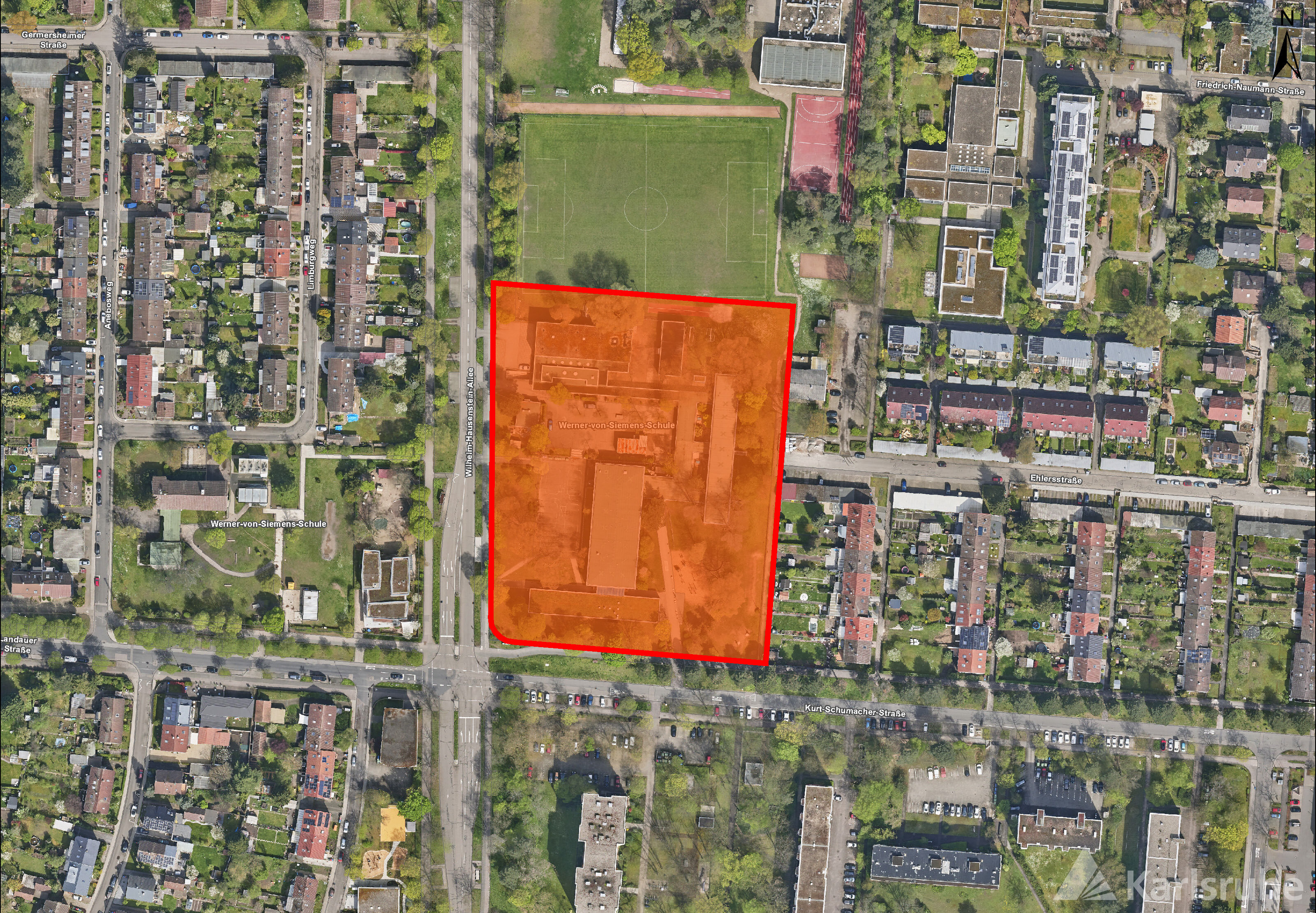 Die Werner-von-Siemens-Schule in der Karlsruher Nordweststadt soll an ihrem Hauptstandort in der Kurt-Schumacher-Straße 1 erweitert und modernisiert werden. Die verschiedenen Standorte der dreizügigen Grund- und zweizügigen Werkrealschule werden dort auf einen gemeinsamen Campus zusammengeführt. Im Endausbau sollen circa 700 Schülerinnen und Schüler unterrichtet werden. Für diese Planungsaufgabe hat das Amt für Hochbau und Gebäudewirtschaft 2020 einen Wettbewerb ausgelobt. Zur Realisierung der Planung ist eine Änderung des derzeit geltenden Bebauungsplanes notwendig.