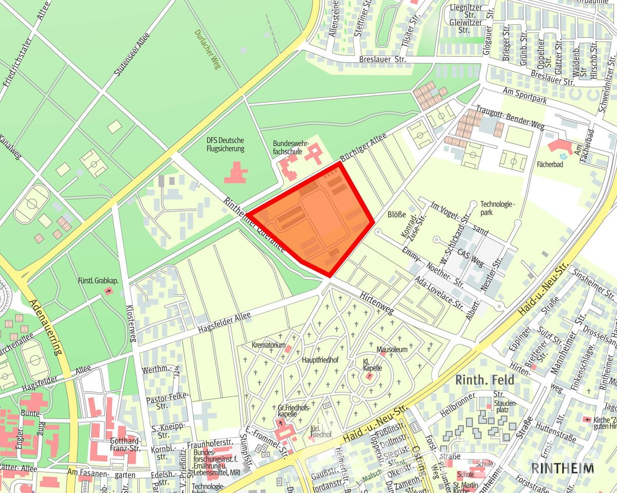 Auf dem Areal des Landes Baden-Württemberg, der ehemaligen Mackensen-Kaserne, wird die weitere Nutzung des Standortes als Forschungscampus des Karlsruher Institutes für Technologie geplant.