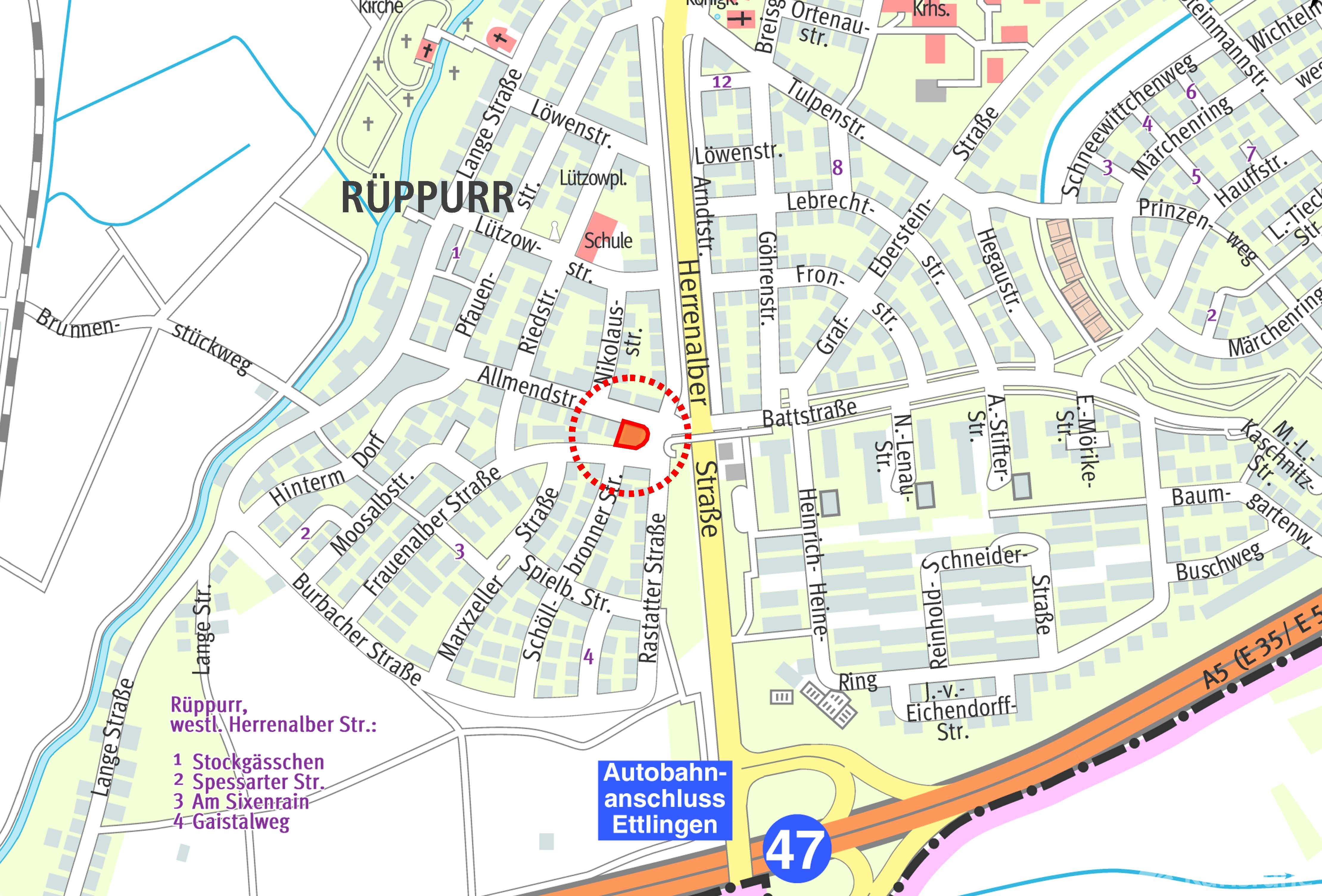 Ziel des Bebauungsplanes ist die Neuentwicklung des bestehenden Geschäfts- und Wohnhauses in der Frauenalber Straße 2 in Karlsruhe-Rüppurr.