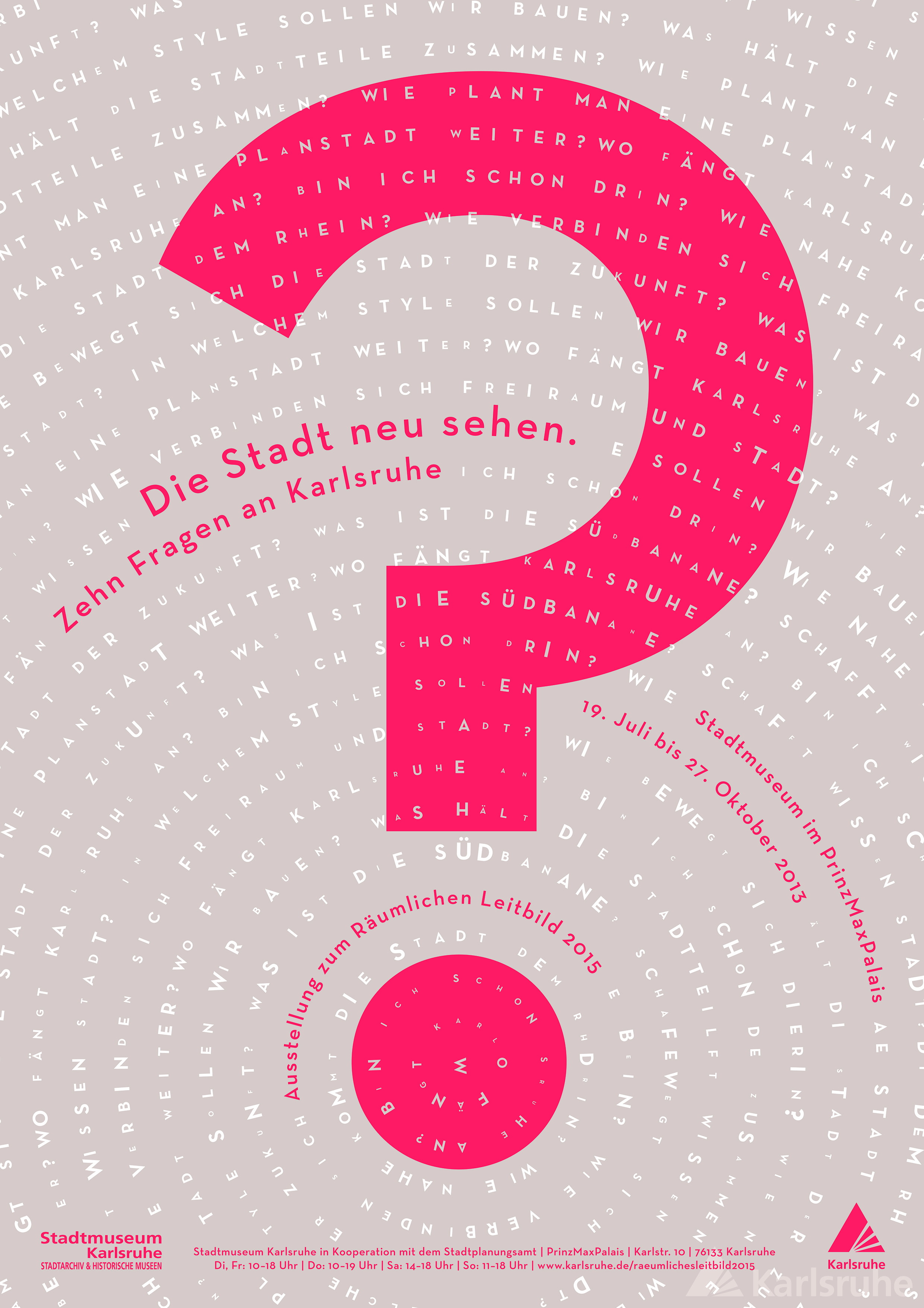 Im Rahmen einer Vorun­ter­su­chung zum Räumlichen Leitbild wurden zehn Fragen an Karlsruhe erarbeitet, die die verschie­de­nen räumlichen Zukunfts­op­tio­nen der Stadt veran­schau­lich­en. Die Ausstellung „Die Stadt neu sehen“ machte die Visionen für die Öffentlichkeit sichtbar.
