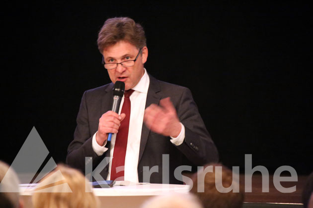 Eröffnet wurde der Update-Abend von Oberbür­ger­meis­ter Dr. Frank Mentrup. Mit dem Räumlichen Leitbild, das Ende des Jahres dem Gemein­de­rat als Beschluss vorgelegt werden soll, verbindet der Oberbür­ger­meis­ter eine klare Positio­nie­rung der Stadt. „Karlsruhe bekennt sich damit zu einer flächen­spa­ren­den Boden­po­li­tik, die Entwick­lungs­räume im Außen­be­reich ausschließt und Landschafträume bewahrt.“ Er verwies in seiner Eröff­nungs­rede unter anderem auch auf die Leitmotive der Grünen Stadt und die Symbiose zwischen Stadt und Landschaft, die mit dem Leitbild als Grund­ge­dan­ken und „Erbgut“ Karlsruhes ebenso definiert wird wie die Innenstadt als „Ort der Identi­fi­ka­tion, Integra­tion und Vielfalt“. Die insgesamt sieben Stoßrich­tun­gen, die im Rahmen des Leitbild­pro­zes­ses erarbeitet wurden, stellen „stra­te­gisch relevante Themen dar, welche die Allein­stel­lungs­merk­male Karlsruhes stärken“.