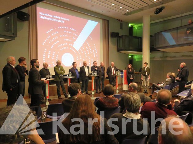 Im zweiten Teil des Abends wurden gemeinsam mit Experten aus Po­li­tik, Wissen­schaft, Verwaltung und Planungs­pra­xis sowohl der Leit­bild­pro­zess, die Ergebnisse und auch die damit verbun­de­nen Chan­cen und Heraus­for­de­run­gen diskutiert. Professor Dr. Rikle­f Ram­bow vom Fachgebiet Archi­tek­tur­kom­mu­ni­ka­tion am KIT lobte den Pro­zess, bei dem das Stadt­pla­nungs­amt bis zum Schluss an einem ­Dis­kurs mit allen Betei­lig­ten inter­es­siert war: „Schaut man rück­bli­ckend auf den Prozess der vergan­ge­nen vier Jahre, kann man sagen, dass mit diesem Patchwork verschie­dens­ter Forma­te viele unter­schied­li­che Gruppen der Bevöl­ke­rung in die Diskus­sion ein­be­zo­gen wurden.“