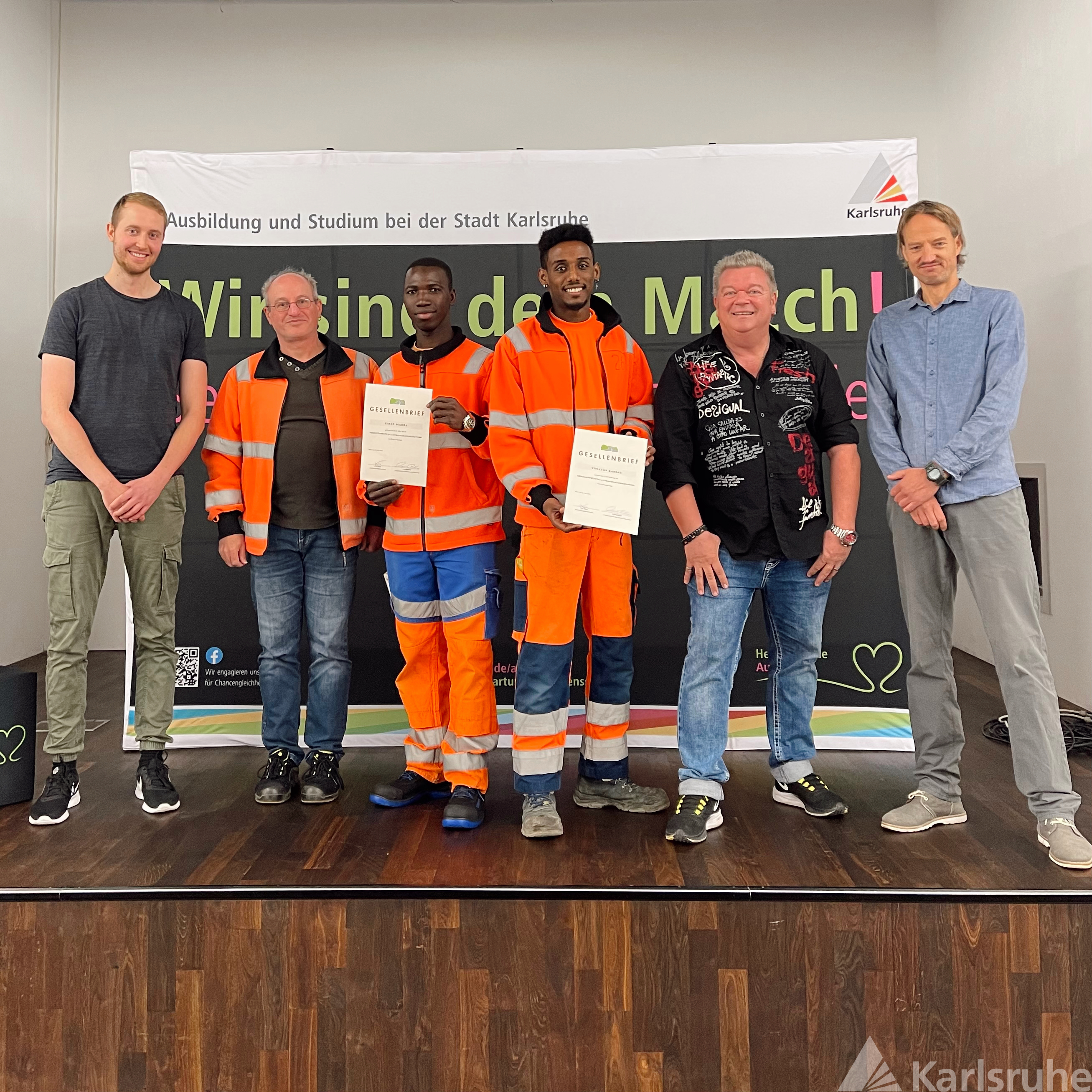 Bürgermeister Dr. Käuflein überreicht unseren Straßenbauern (Jahrgang 2019) den heiß ersehnten Gesellenbrief. Beide beschäftigt die Stadt Karlsruhe nun dauerhaft als gelernte Fachkräfte.