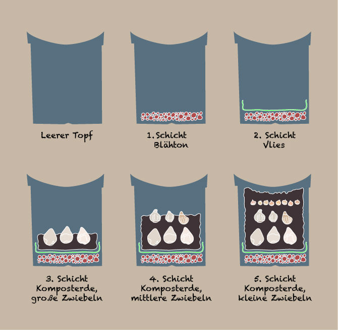 Grafik mit den einzelnen Pflanzschritten: Im Querschnitt durch einen Blumentopf werden die Schichten von Erde und Blumenzwiebeln gezeigt. Pflanzzwiebeln in einem großen Topf schichten. © motionmind.studio