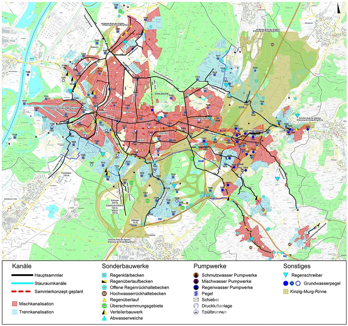 Die Grafik zeigt das Kanalnetz in Karlsruhe.