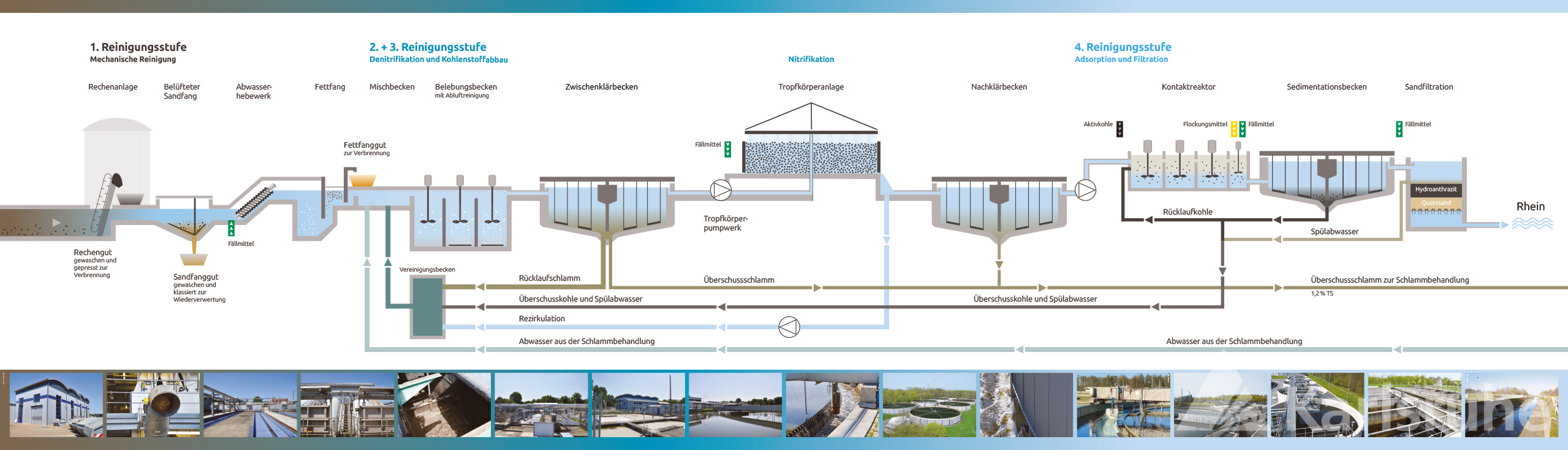 Um dies zu erreichen wird das bereits geklärte Abwasser durch zwei Sandschichten mit unterschiedlicher Körnung geleitet und ein weiteres Mal gefiltert. Erst danach fließt es in freiem Gefälle über die Alb in den Rhein. Ein Teil des gereinigten Wassers wird zudem für betriebliche Zwecke des Klärwerks genutzt, beispielsweise als Kühlwasser für die Klärschlammverbrennung.