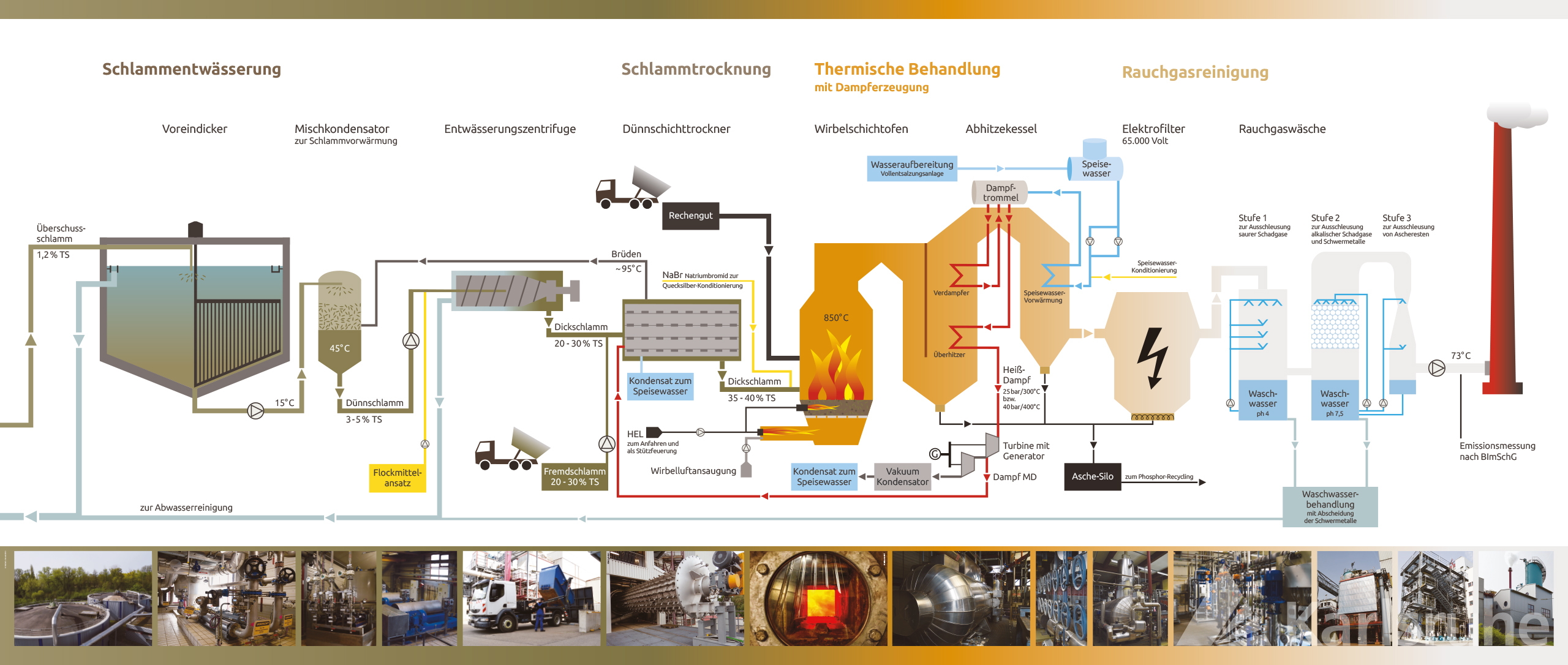 Der verbleibende Klärschlamm aus den vier Reinigungsstufen wird zunächst vorgetrocknet und anschließend der Schlammverbrennungsanlage zugeführt.