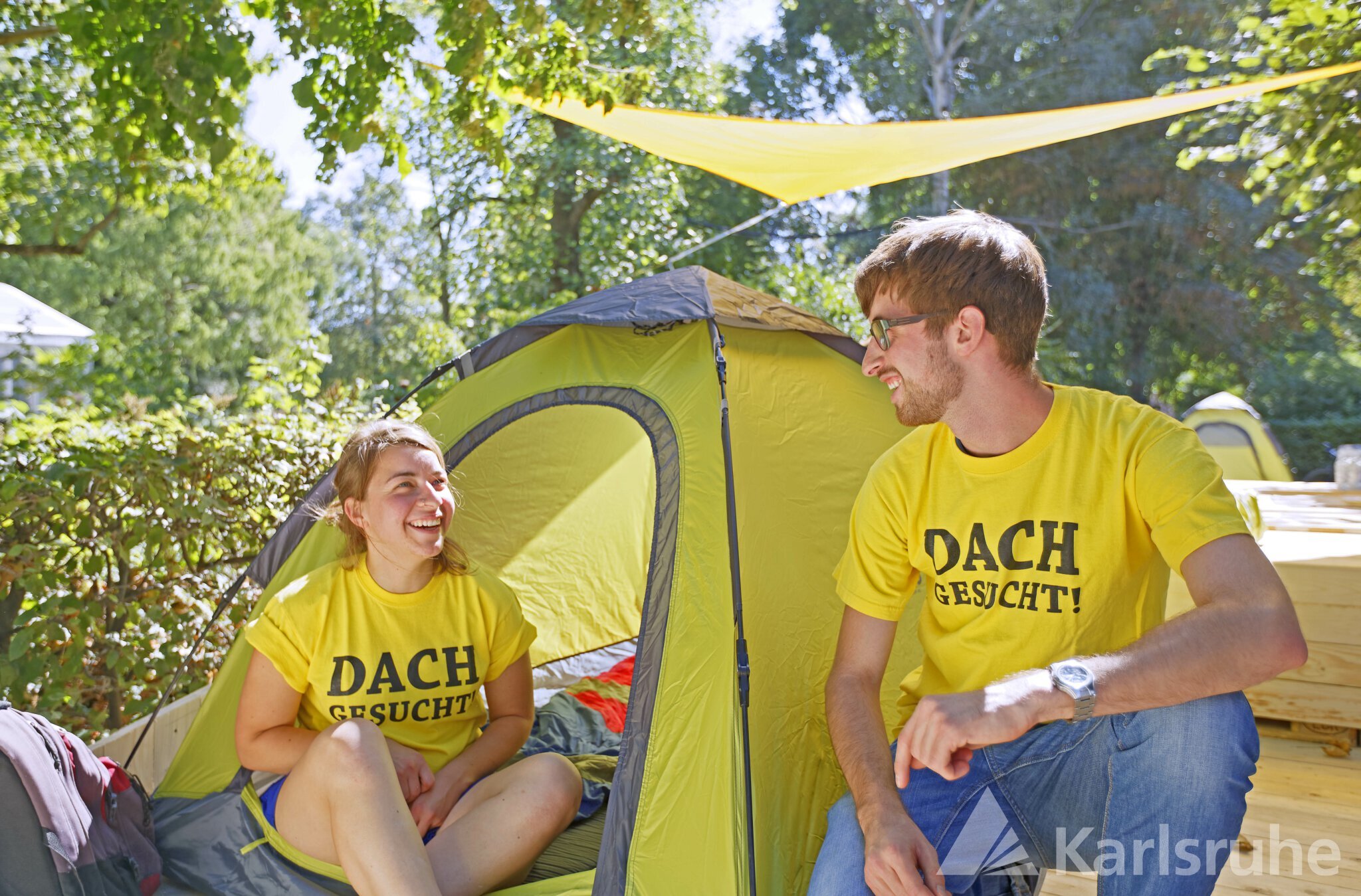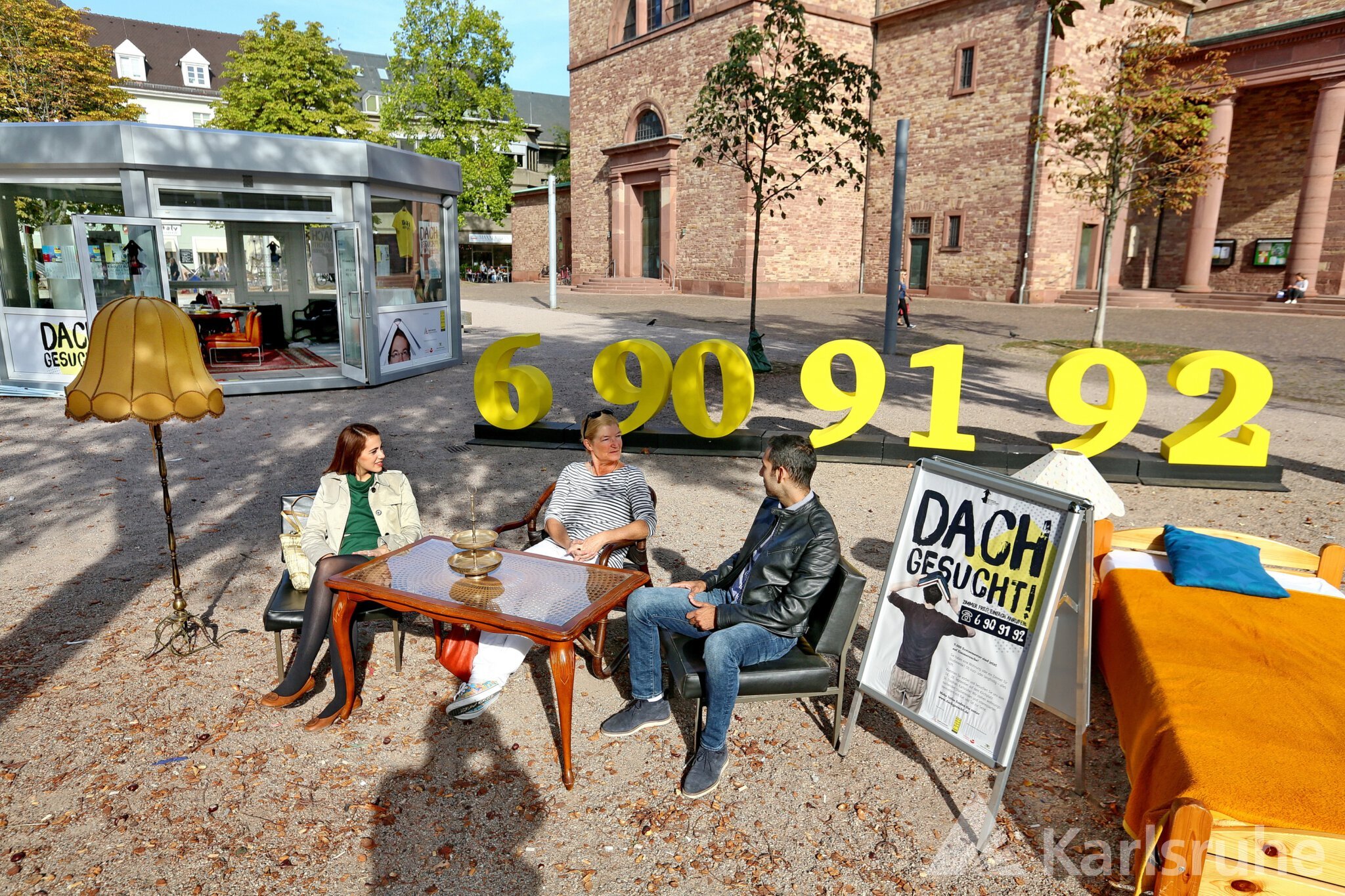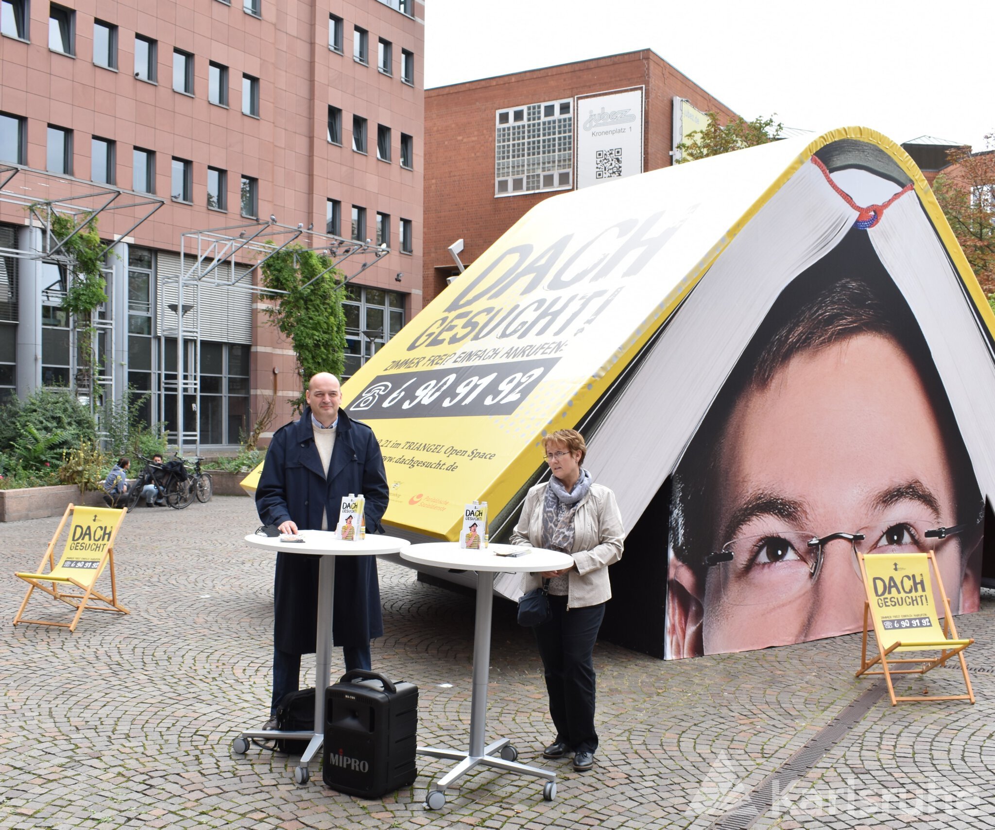 Dabei soll die Wohnraumkampagne „DACH GESUCHT!“ helfen: Das Wissenschaftsbüro der Stadt Karlsruhe und das Studierendenwerk machen auf den Wohnraumbedarf junger Studierender und Auszubildender aufmerksam. Optischer Hingucker der Kampagne ist ein aufge­schla­ge­nes Buch auf dem Kopf. Es steht für das sprich­wört­li­che „Dach über dem Kopf“, das viele Studie­rende und junge Menschen in Ausbildung dringend suchen.